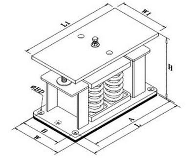 此產品具有安裝靈活性大,穩定性好,固有頻率低,隔振效果顯著等特點。安裝時可直接安放在設備下,若動力設備擾力較大,先調節重心,並將減振器底座固定孔用螺栓固定地基。