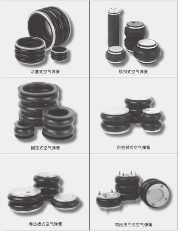 橡膠空氣彈簧俗稱氣胎、波紋氣胎、氣囊等。它是一種精密設計的橡膠纖維波紋管,本身並不 提供力或支撐載荷,而是通過空氣壓縮機向其內部充入壓縮空氣來實現力的傳遞和彈性作用。 根據對行程的要求,空氣彈簧一般被設計為 1-3 曲,