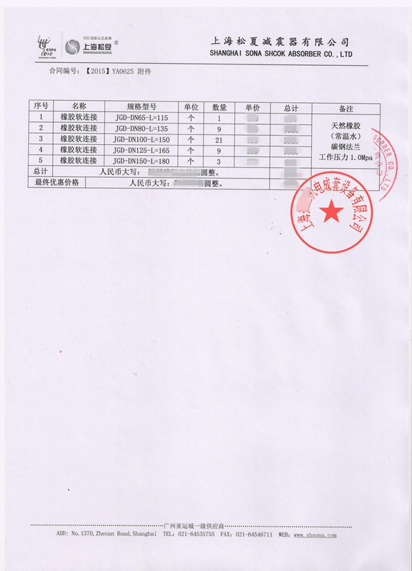 周期:2016.2.19服務內容:響水電廠DN2200耐高溫橡膠膨脹節淞江合同案例簡介:上海淞江91黄瓜视频APP下载集團有限公司2014年8月16日為響水電廠配套DN2200mm耐高溫橡膠膨脹節產品,該產品主要用於電廠發電機組,耐高溫140度以下,采用三元乙丙橡膠生產。